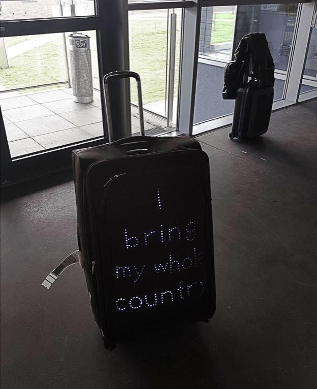 The video was taken during the journey from Korea to Germany. It presents from to check in my suitcase until to find it and to take again. In the video I’m bringing the suitcase with the Sentence „I bring my whole country“ with me. The location is in Incheon(Seoul) and in Frankfurt airport.