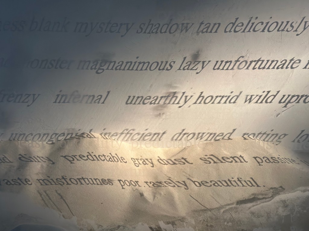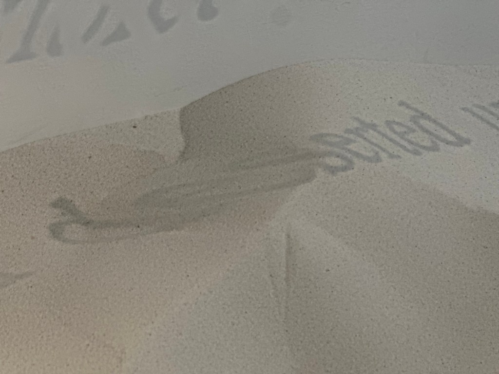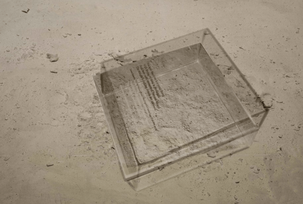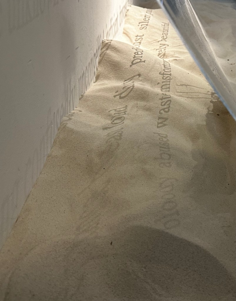 Installation view: 1 acrylic boxes(45x50x30cm), concrete powder/dust, sand, spotlight, 2025