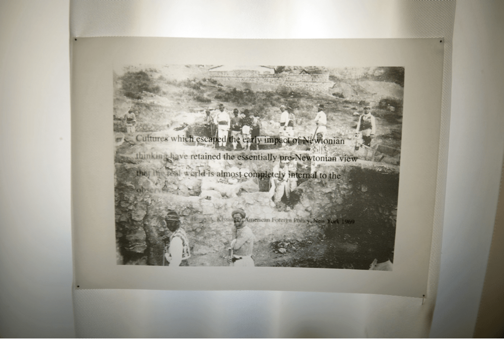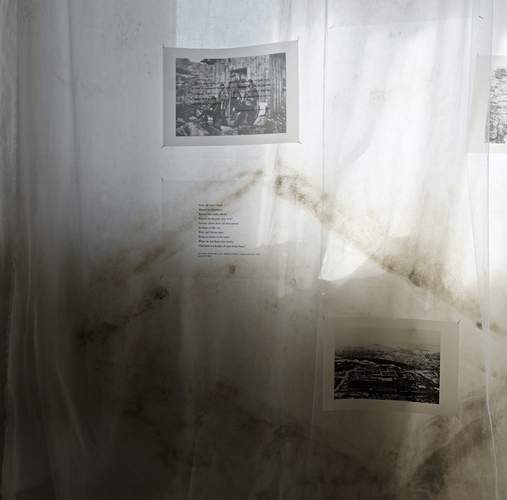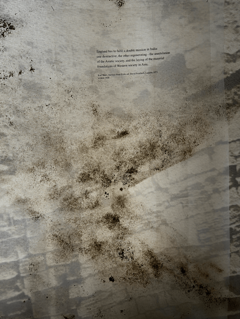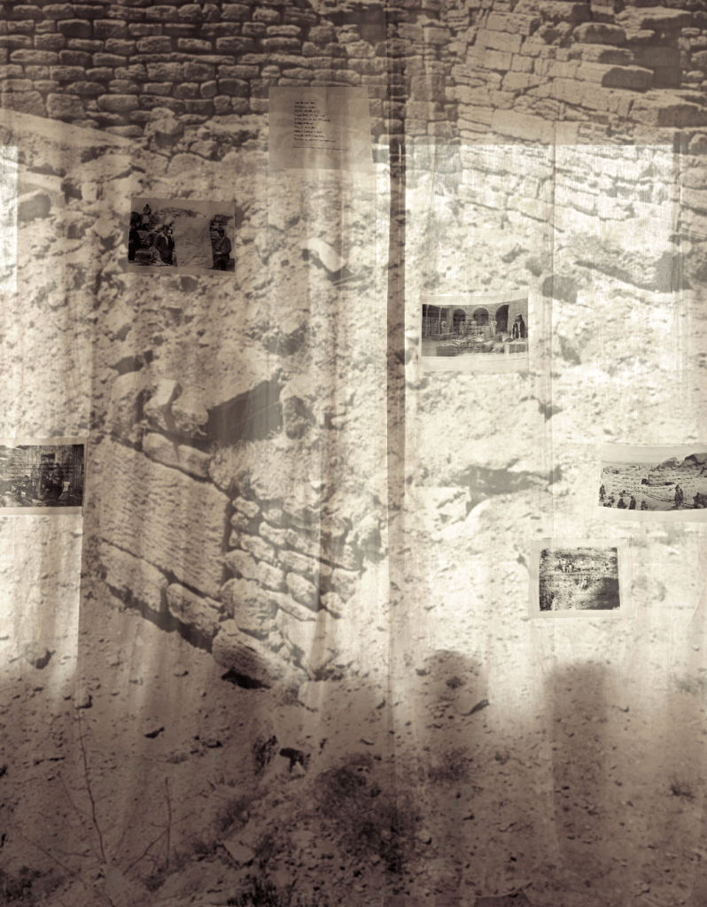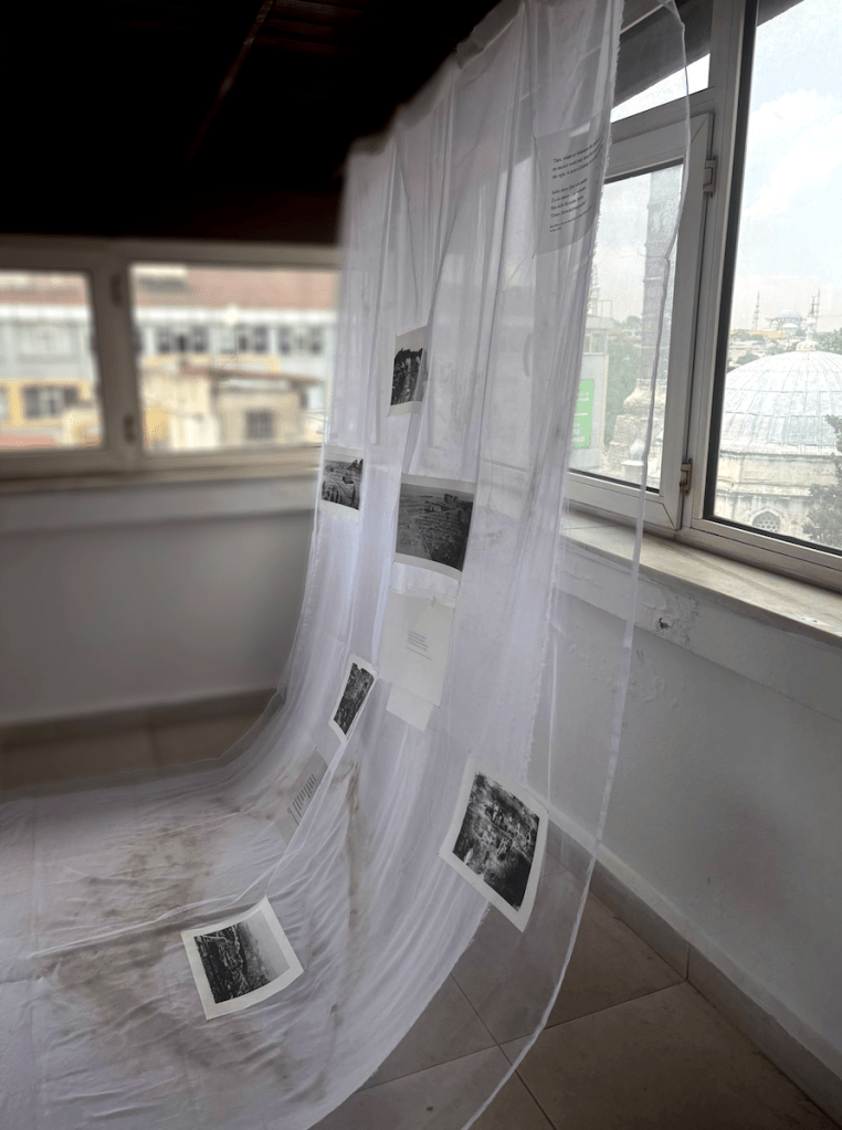 Installation view: Research reimagine and mapping, Research reimagine and mapping: collage(archival photography with text) 280x150cm, exhibition in Barahan, Istanbul, 2025